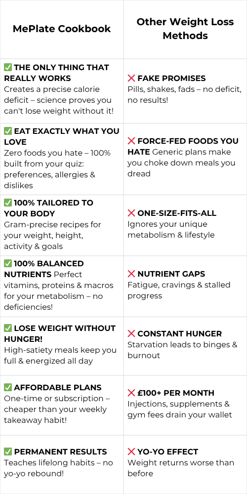 You'll NEVER feel deprived. You'll NEVER eat foods you dislike. Every recipe is scientifically calculated to create the perfect caloric deficit for YOUR body – so you lose weight naturally while eating delicious meals you actually look forward to.